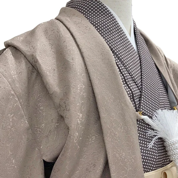 生命力が強く蔦を伸ばすことから、吉祥文様として多く使われてきた唐草の地紋が着物または羽織に用いられています。