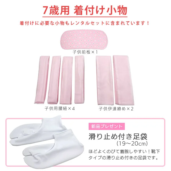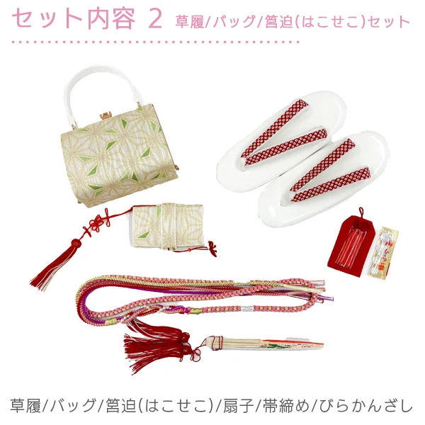 着物・長襦袢(半衿縫付済)・作り帯・筥迫(はこせこ)セット(扇子、はこせこ、丸ぐけ帯締め、びらかんざし、草履、バッグ)・帯揚げ・志古貴(しごき)、滑り止め付き足袋(19~20cm)