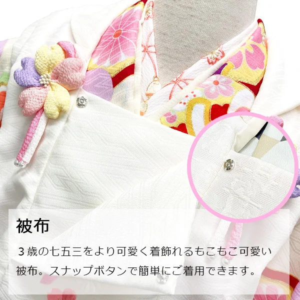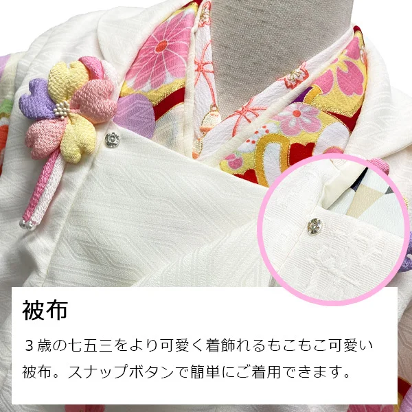桜の刺繍とちりめんの花飾りがポイントの白色の被布が、3歳ならではの子供らしい可愛さと純真さをさらに演出してくれます。