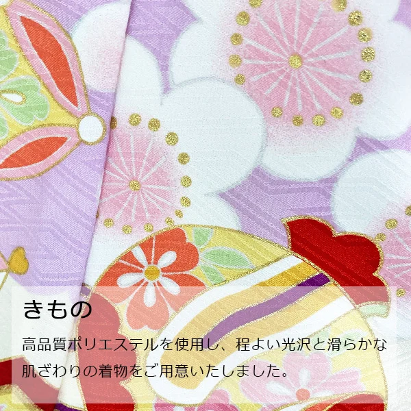 厄除けの意味のある紗綾形の地紋の生地に染められた藤色の着物に、おめでたい柄たちが踊るように散りばめられ、元気いっぱいなお子様の雰囲気を表現してくれます。藤色は藤の花の紫色からきており、古来より高貴な色とされ、気品や風格を備えた色として尊ばれてきました。