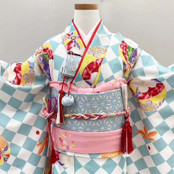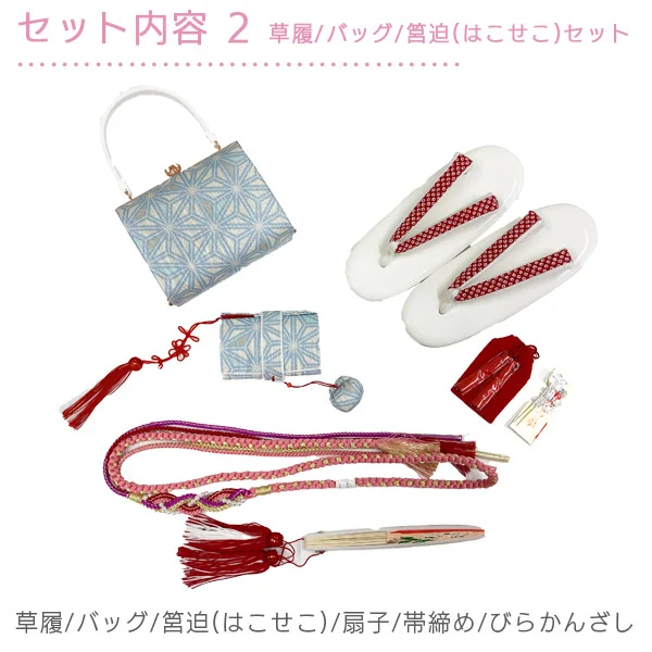 着物・長襦袢(半衿縫付済)・作り帯・筥迫(はこせこ)セット(扇子、はこせこ、丸ぐけ帯締め、びらかんざし、草履、バッグ)・帯揚げ・志古貴(しごき)、滑り止め付き足袋(19~20cm)