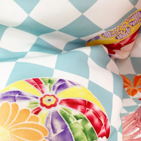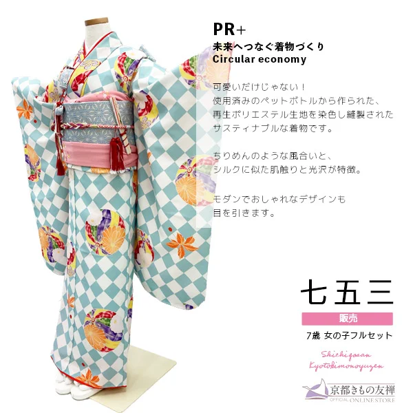 使用済みのペットボトルから作られた、再生ポリエステル生地を染色し縫製されたサスティナブルな着物です。